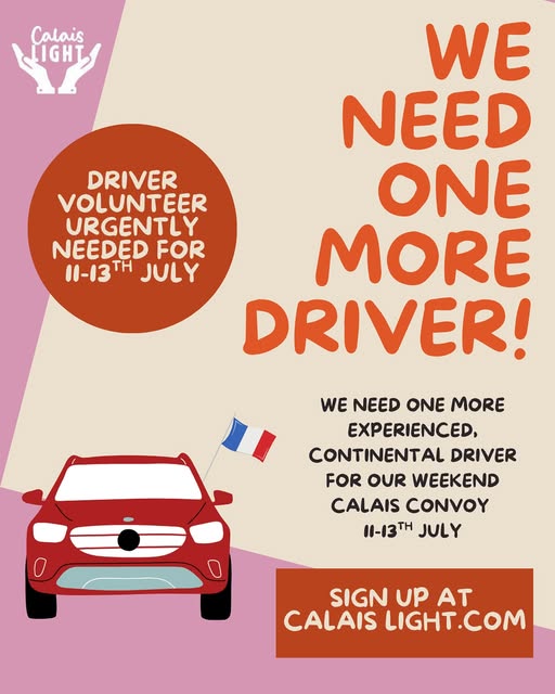 You’ll drive to Calais on Friday 11th July & volunteer with our partner NGOs alongside 29 other volunteers and be back on Sunday evening. It’s around £100 all in for ferry crossing, hotel accommodation & donation. Without enough drivers, we cannot go ahead with the trip and our partner NGOs urgently need people power to help as many refugees as possible.