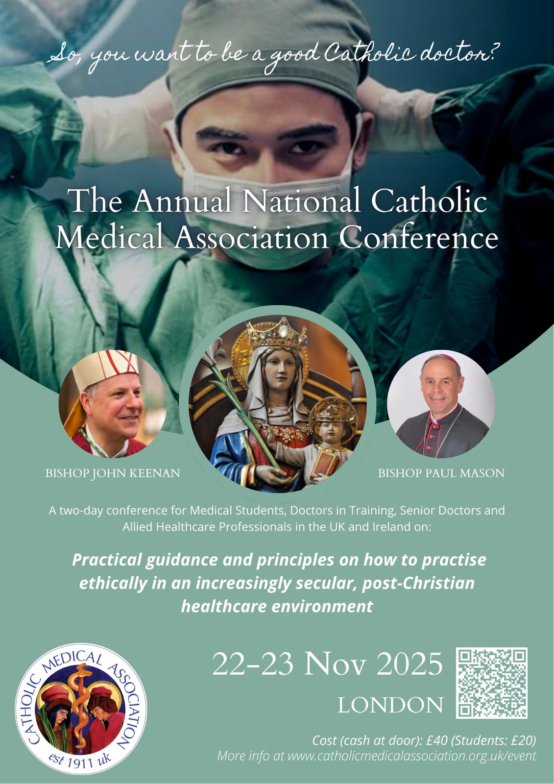 Speakers include Bishop Paul Mason, Bishop John Keenan, and several experienced Catholic doctors.